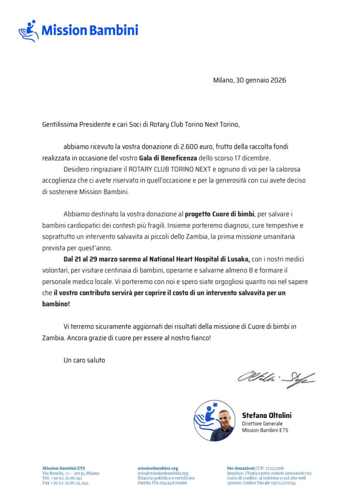 Service Mission Bambini ETS Con il Galà di natale il Rotary Club Torino Next ha raccolto 2.600 € che sono stati destinati a Mission Bambini ETS. Condividiamo con orgoglio la lettera di ringraziamento ricevuta. Finanza Islamica vs. Finanza Convenzionale Supporto al Rotary Campus 2026 distretto 2031 e 2032